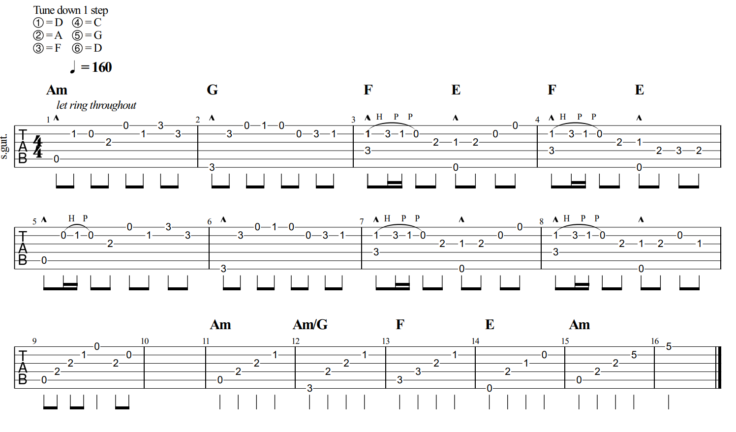 Refrén sestává nejprve v dvojitém opakování tlumených nebo netlumených úhozů akordů E, F, Dmi a E, pak nějaké to máchání v Dmi, G7, C, E4 a E načež je to zakončeno snadným rozkladem akordů Ami, Ami/G, F, E a Ami. V tom úplně posledním Ami je pak takový slajd na 5. pražec, kde se zahrají poslední dva tóny.