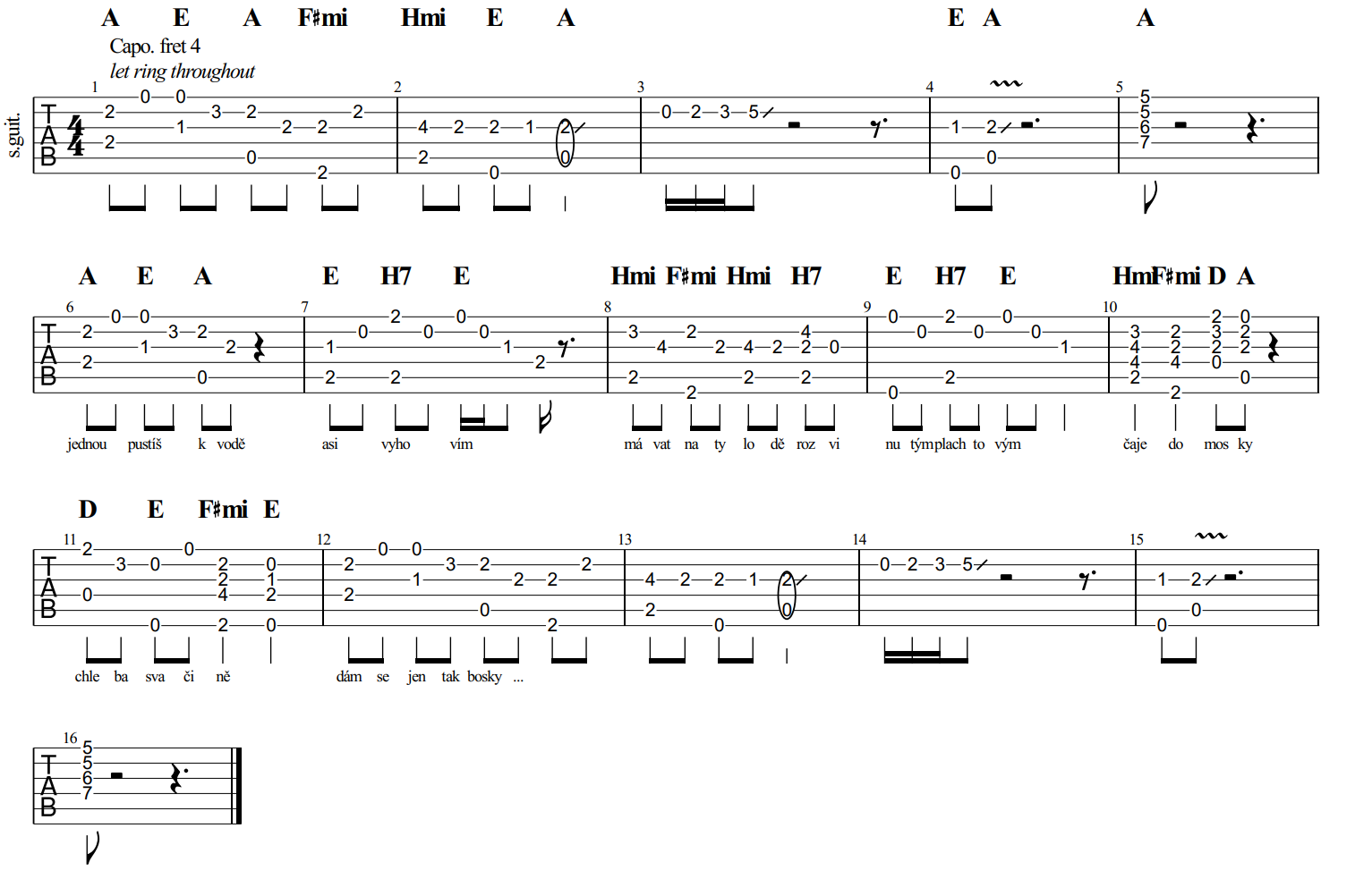 Tabulaturu jsem napsal podle studiové verze. Sloka začíná stejně jako předehra, pak rozklad E a H7 a následuje pasáž „…budu mávat na ty lodě…“ s akordy Hmi, F#mi a H7. Buď se to hraje jako „plné“ akordy stejně jako v následující sekci (takto to Plíhal hraje na TV záznamu) nebo se na každou slabiku/dobu vloží ještě jeden tón. Takto to hraje Plíhal na CD a je to trochu těžší. Sloka končí zopakováním kompletní předehry.