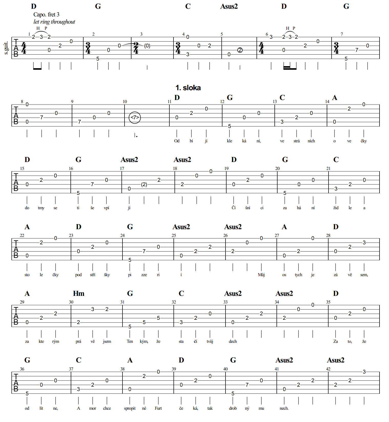 Zbytek tabulatury je v přiloženém archivu. Udělal jsem takový pokus – audio export z aplikace Guitar Pro jsem nahrubo zmixoval ze zpěvem, který jsem izoloval ze studiovky. Pro představu, jak to bude znít se zpěvem je to celkem použitelné…
