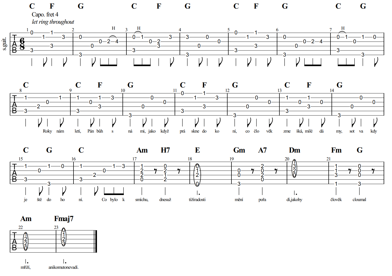 Celou píseň jsem ji napsal a hraji tak, jak je vidět níže. Hraje se s kapodastrem na 4. poli, tónina E dur.