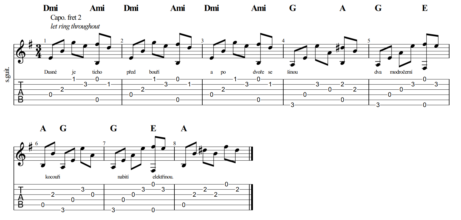 Tabulaturu jsem si napsal už před téměř dvaceti lety, ale píseň jsem poslední dobou vůbec nehrál. Převádím si teď všechny papírové záznamy do aplikace Songbook Pro a to je i dobrá příležitost píseň doplnit na těchto stránkách. Vzal jsem tedy onu prastarou tabulaturu, rychle znovu projel a opravil pár chyb.