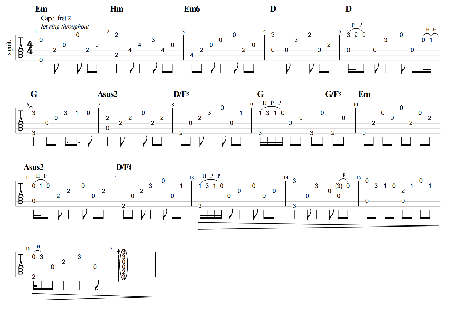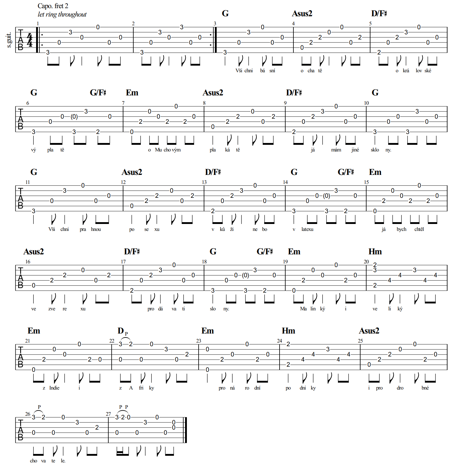 Přepis písně tak, jak byla na CD, je níže. Hraje se s kapodastrem na 2. poli, tj. A dur. Technicky to myslím není vůbec složité, rozklady akordů jsou hratelné a není to ani moc rychlé.